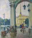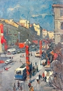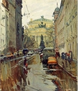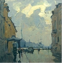 Художник любил Ленинград в дождливую погоду и часто писал его таким с особым настроением, виртуозно передавая игру отражений на мокром асфальте, блестящие от дождя крыши машин, стайки пешеходов под зонтиками. Эта тема развивалась им на протяжении десятилетий и отражена в работах «Дождливый день» (1958), «Дождливый день в Летнем саду» (1961), «На Дворцовой площади» и «На Кировском проспекте» (обе 1965), «Невский проспект» (1977), «Невский проспект в дождь» (1983) и др.