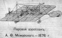 Первые идеи касательно изобретения, призванного в дальнейшем прославить конструктора в веках, появились еще в 1876 году. Именно в это время Можайский впервые продемонстрировал в Морской академии свою летающую модель, разработанную на основе пружинного двигателя. Собираемый постепенно летательный аппарат его конструкции окончательно был готов лишь к 1882 году. Первое испытание машины состоялось 20 июля того же года, но оказалось неудачным. Во время разбега самолёт оторвался от земли, но потерял скорость и рухнул на крыло, получив повреждения.