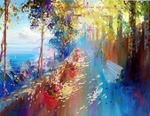 На его полотнах всегда прекрасная погода. Впечатление будто он пишет свои произведения не красками, а самим солнечным светом, его сказочные пейзажи пропитаны романтикой и теплом.