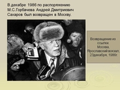 Освобожден из "горьковской ссылки" он был лишь с началом перестройки, в декабре 1986 года – после почти 7-летнего заключения. Вернувшись в Москву, ученый не поменял своих взглядов и до самой смерти выступал в защиту мира и прав человека.