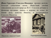 1892 года родился Иван Сергеевич СОКОЛОВ-МИКИТОВ (в урочище Осеки, Калужская губерния), русский советский писатель, натуралист и путешественник, журналист, специальный корреспондент.
