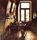 Кроме пейзажей, особым увлечением художника были интерьерные композиции. Работы этого направления отображают уютные уголочки и рабочие места жилья человека, обстановку его быта, работы, преисполненные любовным чувством их хозяев, окутанные элегической поэзией её интимного существования. Это уголки комнат с красными, зелёными, белыми, радужными лампами, креслами, письменными столами.
