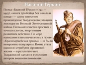 Но самой знаменитой стала созданная во время Великой Отечественной войны поэма «Василий Теркин. Книга про бойца». Здесь суровая правда о войне представлена глазами простого солдата.