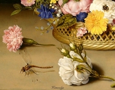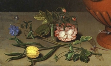 На полотнах Амброзиуса Босхарта рядом с букетами цветов зачастую изображены бабочки или ракушки. Во многих случаях цветы тронуты увяданием, что вводит в полотна художника аллегорический мотив бренности бытия.