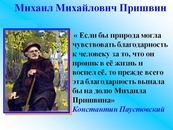Почти все его произведения посвящены описаниям собственных впечатлений от встреч с природой, описания эти отличаются необычайной красотой языка. Константин Паустовский называл его «певцом русской природы», Максим Горький говорил, что Пришвин обладал «совершенным умением придавать гибким сочетанием простых слов почти физическую ощутимость всему».
